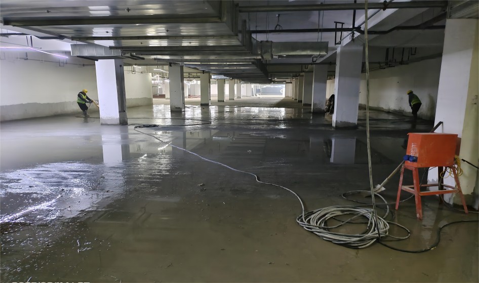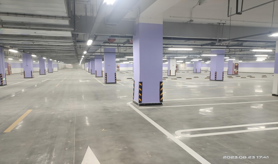 我司主要负责地下二层、地下一层及坡道金刚砂地坪施工,墙面墙裙施工,所有划线、水泥踢脚线、标识、各类指示、导视牌、广角镜、车档、减速带、车位护角等安装施工。