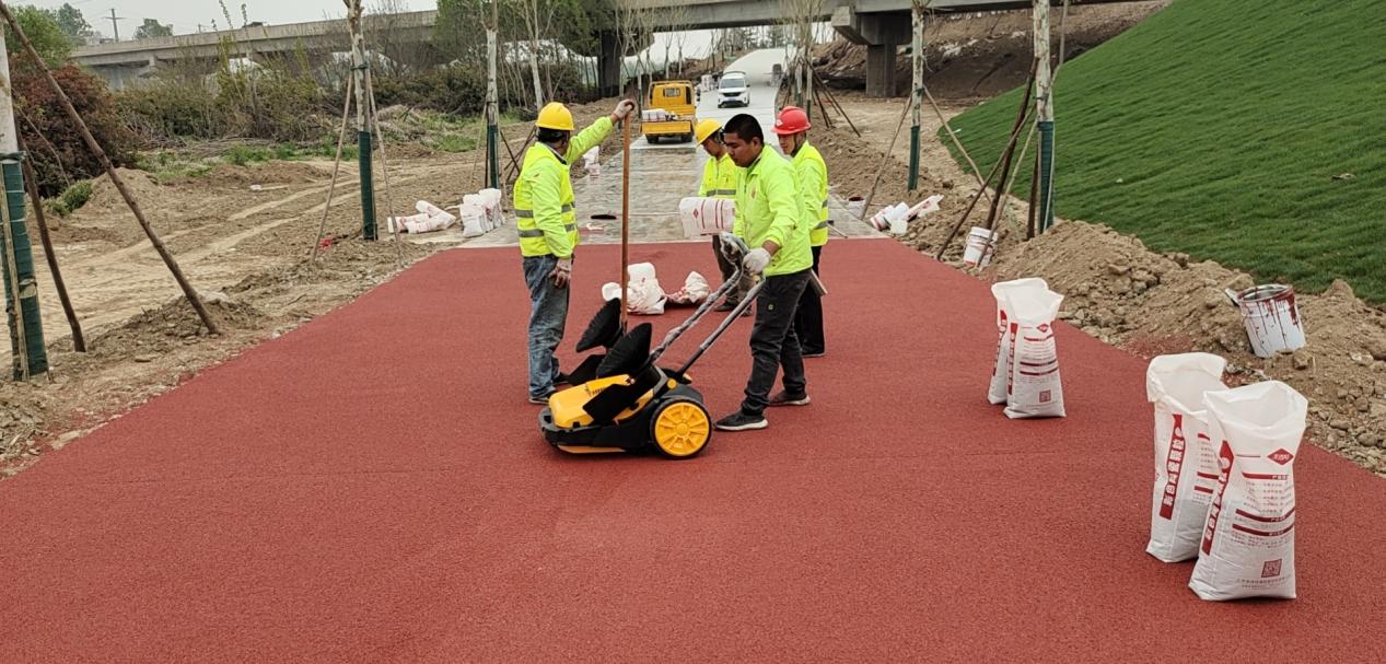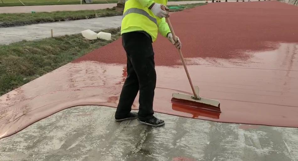 5、 专用粘合剂:把搅拌均匀的粘合剂用刮涂工具均匀敷涂于路面上(使用刮板或刮刀),按照每平方米2.0kg用量,可以达到平均厚度;