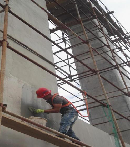 本产品作为仿清水混凝土装饰基材修补料,可修补混凝土浇筑过程中形成的挫台、蜂窝麻面及颜色不均匀现象具有优异的基材附着性、抗开裂性及优良的防水性能。